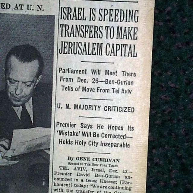 紐約時報:1949年12月13日,本-古里安宣佈耶路撒冷為以色列首都