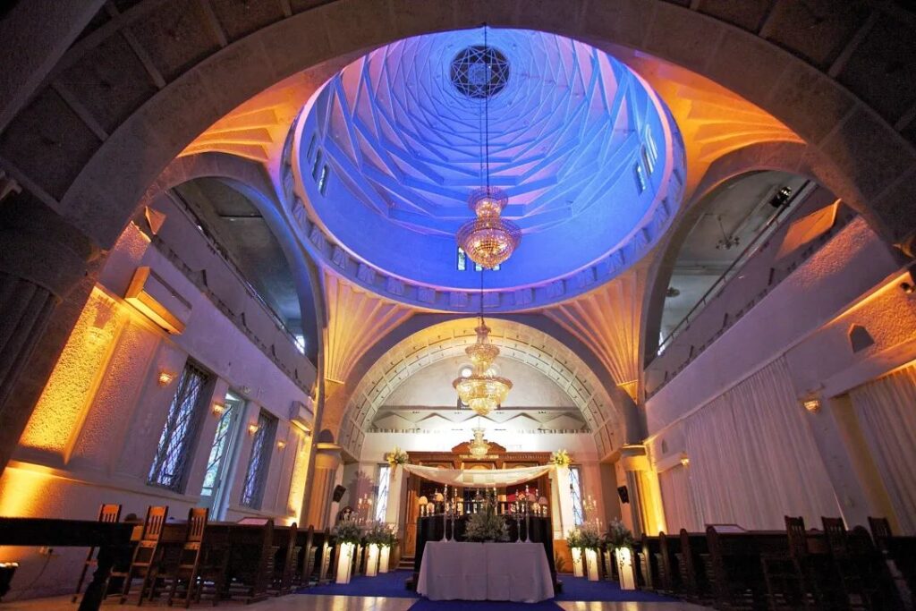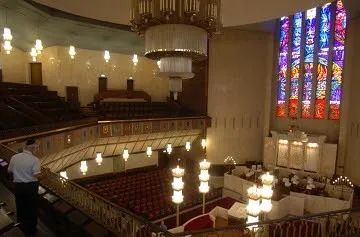 猶太會堂的內部與外部一樣令人驚嘆——彩色的玻璃窗,柔軟的地毯…會堂可容納600多人。會堂內部沒有配置承重柱,外加上貝殼的形狀,無論你坐在哪裡,都能看到、聽清前方的拉比。