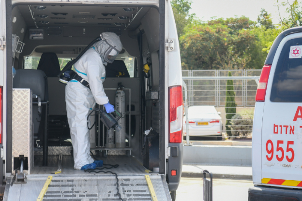 一位工人在醫療中心外進行車輛消毒, 圖片來源:以色列時報