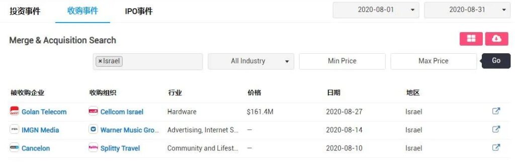2020年8月,以色列共有30筆獲投項目;
